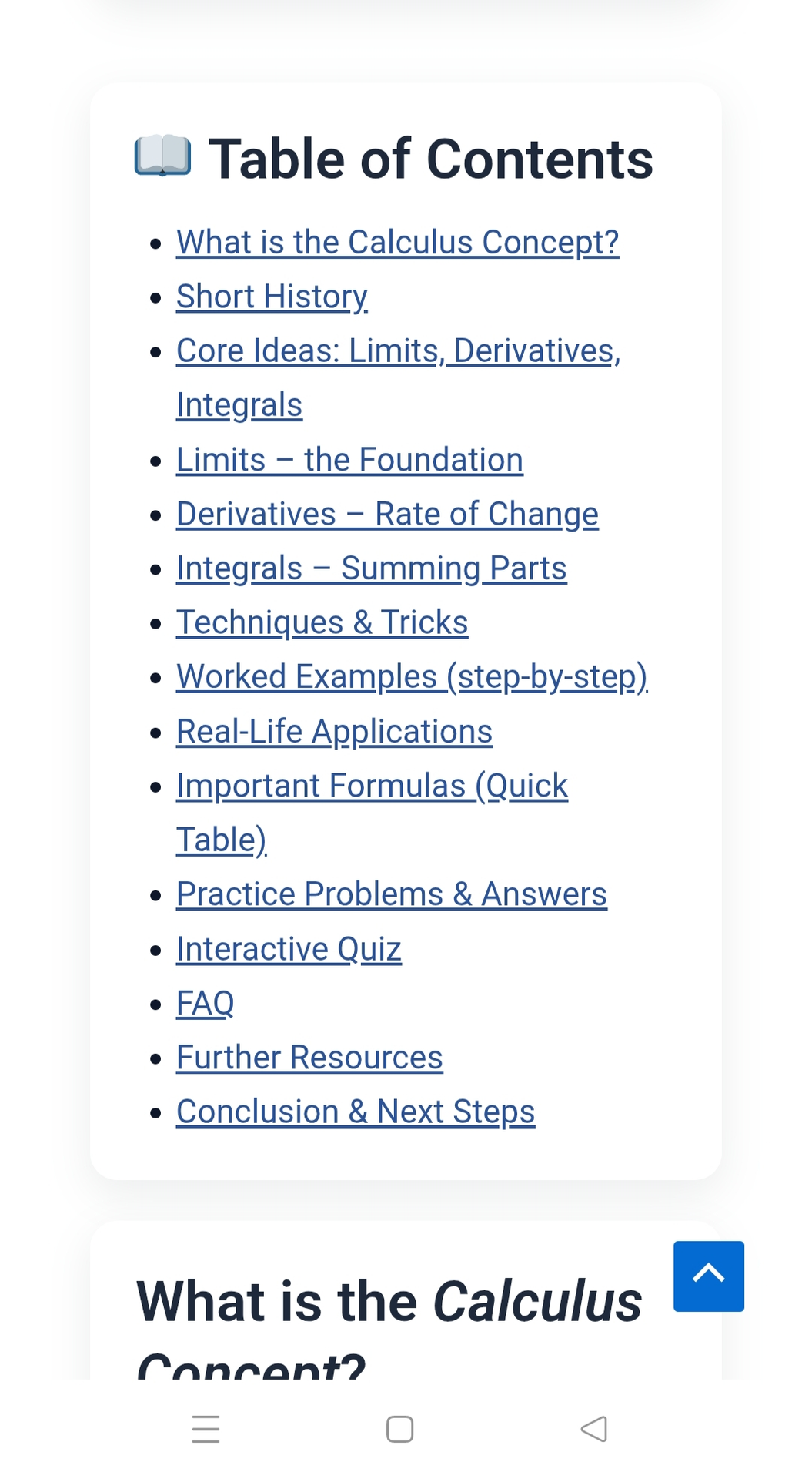 This page gives you a full guide to the calculus concept. Publish it as your pillar (main) page. Then create supporting pages (limits, derivatives, integrals, examples, quizzes). Link them back to this page — that builds authority in Google’s eyes.