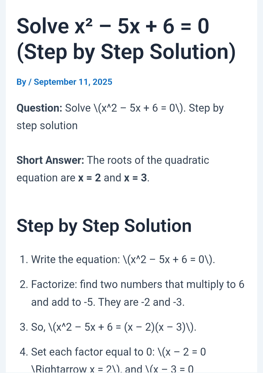 Question: Solve \(x^2 - 5x + 6 = 0\). Step by step solution Short Answer: The roots of the quadratic…